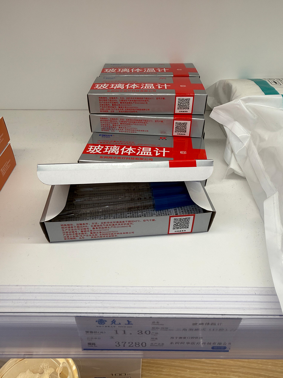 2025年12月11日,在上海市杨浦区靖宇东路上的国大药房门店内,有2款水银温度计在售。本文图片均为 澎湃新闻记者 陈斯斯 摄